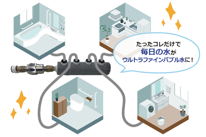 エルラインシステムUFB⁺はシャワーヘッドだけではなく家じゅうにウルトラファインバブル水を供給することができる商品です。